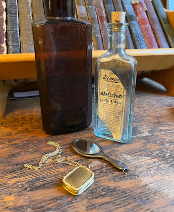 Somehow, these many years later, I do have a few small items from Mom's New England life. That probably means my father held onto them and passed them to me after the house fire. Two of them, small and without family initials, remain tiny treasures to me ... and those are what I carried to the Concord Historical Society last year, when I suddenly needed cover images for my newest novel, THE BITTER AND THE SWEET (Winds of Freedom Book 3). Concord's Beth Quimby kindly opened the museum to me, so I could stage a few photographs.