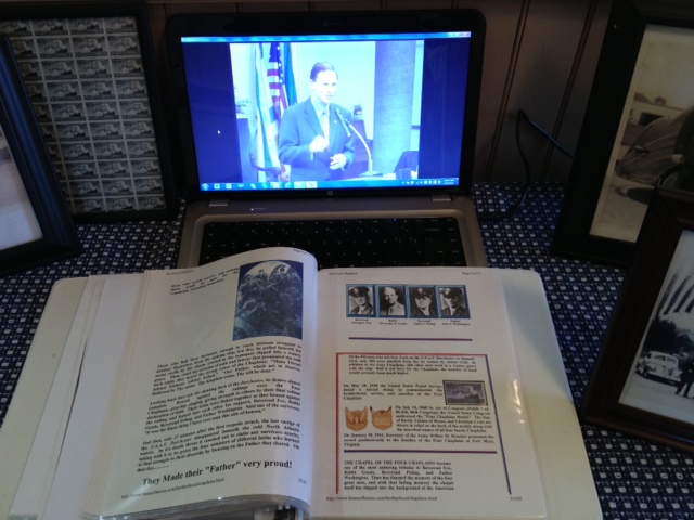 On this Memorial Day weekend, we motored over to the Concord Historical Society to see a special exhibit on Fox and the other three chaplains, including many magazine and newspaper articles, a video, and a state proclamation honoring Fox. It seemed a perfect time for the town to reflect on its homegrown hero, a man who never fired a weapon in the war but whose action saved lives.