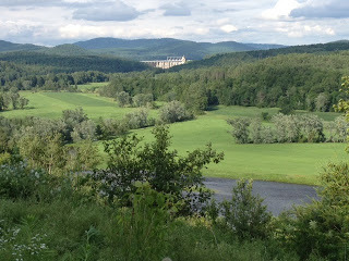The two photos shown here were taken just a few feet apart. One is the simple (but lush!) scenic view from the rest area on Interstate 91, just north of the Barnet, Vermont, exit. It suggests a forested landscape without many people. The presence of the county seat is well hidden -- along with the dark side of some lives in the region, as well as the thriving movement of technology and information in the towns below.