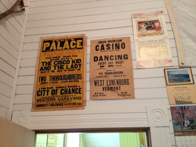 Last but not least, here are two posters that are tacked high over one of the doorways at the Concord Historical Society -- the one on the left is the shows at Tegu's Palace, one of the two St. Johnsbury theaters that I wove into my 1930/Waterford "history-mystery," The Darkness Under the Water. What a gem! And the one on the right, I am guessing, belongs with a street sign that I noticed outside East Concord during our road trip: Dance Hall Road. (It runs into Oregon Road -- more on that, another time.)