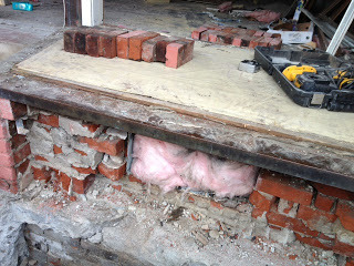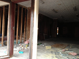 And here are some pix that the construction crew allowed me to snap last week: reconstructing the brick frame for the shop windows; the room where the drugstore used to be (see the tin ceiling?); and the back exterior.