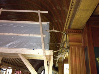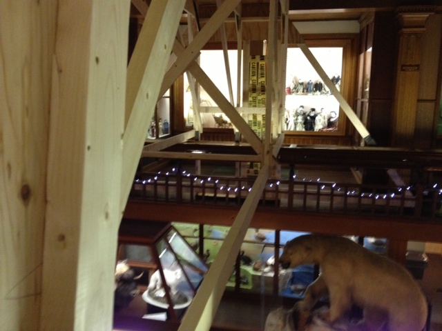 I'm still in the "wide open" stage of preparing for a book I've tentatively titled The Fire Curse. Recently the Fairbanks Museum & Planetarium in St. Johnsbury, Vermont, closed for two weeks to allow a team to install a "fire suppression system" -- the sensors, electronics, pipes, and pumps that can fight a structure fire before it takes lives. The museum's staff kindly welcomed me to look behind the scenes, and a couple of installation crew members paused for a few minutes to answer some questions that I had. I won't give you details now --- but I wanted to share these photos, because they show something you'll never see again: the moveable scaffold that the installing team created, to slide along the balcony railings upstairs, giving the crew access to the vaulted ceiling of the museum, where sensors and spray nozzles needed to be carefully place. Can you spot the antlers, polar bear, and other museum artifacts here and there?
