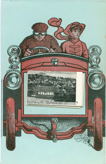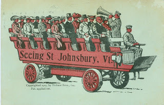 However, although St. Johnsbury did indeed have plenty of tourism in 1907, these images doesn't show the "real thing." (The top one, though, has some real photo images attached to it with an accordion fold.) The cards are among many that were created where town names could be set into the card, and orders placed for "anywhere." Often the cards like this are amusing, and some are romantic, but ... they are stock images, made by the card company without ever visiting the town named on them! That also leads to another entertaining side of the cards as we collect them today: On quite a few that we've seen, the town name has been misspelled!