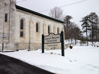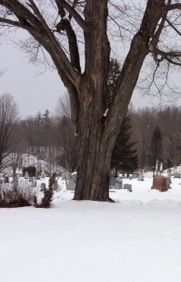 I'm headed into writing the last few chapters of ALL THAT GLITTERS, so as I drove to Waitsfield, Vermont, yesterday, I detoured into the downtown of Montpelier to photograph a couple of locations that are featured in the book. Then I paused outside town at Green Mount Cemetery for some quick photos. When I looked at the big maples that edge the cemetery, I paused and stared. Look closely: Can you see the galvanized-metal sugaring buckets fastened to both sides of the maple tree here?? They were on the entire row of trees along the Route 2 edge of the burying ground.