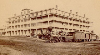 One of the images we talked about is this one from the 1880s of the Memphremagog House, a tourist hotel that could shelter about 400 people! Built in 1838, it was a response to the unusual pattern of New England tourism in the 1800s: People would pack their trunks full of necessities and literally leave the city for six months, to enjoy "country air" and escape the fumes of urban life. You can see how close the train tracks ran to the hotel -- passengers could step down from their rail car and stroll up the path to the front door. Scott pointed out that this was one of several hotels at the time; today's regeneration of Newport's downtown has a lot to live up to!