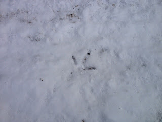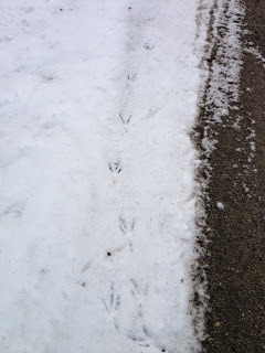 The third photo means a lot to me as I work slowly to bind all the plot threads together in my "Nancy Drew-style" mystery, ALL THAT GLITTERS. I'm in the last few chapters and it has to go "right" in order to build to the climax I want. There are homing pigeons involved in the plot -- and the tracks in photo 3 are of mourning doves, the wilder sort of pigeon here on the high ridge. I hear their plaintive calls all morning. See how the footprints angle back to each other, always crossing, as the round-bodied bird appears to waddle along? That's where we get the expression "pigeon-toed" -- to walk with one's toes pointed inward, so the right and left feet appear to leave crisscross trails.