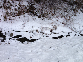 Silent though the woods can be, the larger birds are on the move. With the snowcover down to a fragile couple of inches, seeds are everywhere for them with just a quick scratch. How different they are from one breed to another, though. See the solo turkey track in the first photo? It could fool you if you don't follow further -- the second photo, taken not far from the first, reveals that a family of at least half a dozen turkeys passed along here, crossing the stream around the same point.