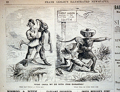 At that time, the term "Chinaman" was derogatory -- much like "Nigger." Cartoons created a persona of the ignorant, lazy, dirty, immoral Chinese, calling this figure "John Chinaman." Here's a short related piece particularly for educators (including relationships to state standards) that accompanies this image of "John Chinaman":