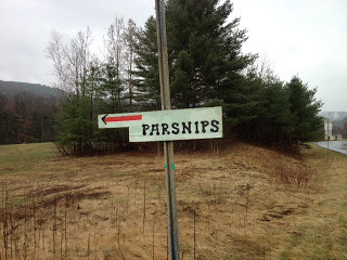 As you can see from today's photo, there's another "spring crop" being offered locally: parsnips. This root crop sweetens significantly over the winter, if you can save it that long, and it makes a great March vegetable. I'm waiting for my lower garden to thaw, so I can dig up another root crop: horseradish.