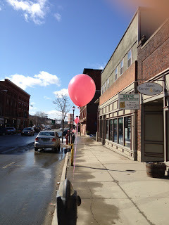 Most poignant to me today are: (1) The recollection of overhearing a busy woman Friday, as her friends tied pink balloons to parking meters, so that even the rough March downtown sidewalks proclaimed Melissa as the area adopted her favorite color. This woman, racing past a balloon-tying friend, called out, "I've made pink roses for us to wear in the bar tonight." (2) The lingering pink balloons, tied to railing, fenceposts, mailboxes, and more.