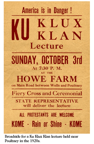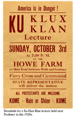 The Vermont Historical Society describes some KKK activity within its Freedom and Unity exhibit, for which much of the material is still available online; the poster shown above is from that exhibit.