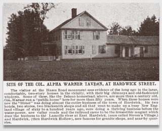 I've got two photos that I want to share, for their roles in possible novels coming up. The first, nicely labeled from its original newspaper use, is an old "tavern" in Hardwick, Vermont. These town or village meetingplaces were some of the largest houses around, and there are still many on what look like back roads today but were once the centers of life in "hamlets" (small villages) formed from working families living close together. The inn that features in The Secret Room is related to this tavern as a structure, but with more emphasis on overnight rooms for travelers. From the size of the pictured tavern here, I'd guess there were rooms for rent in the Hazen Road Warner Tavern, too.