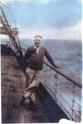 This photo of Joe Kanell, at age 47, shows him on board a ship in 1935, circling the globe, going to see his relatives in Vilna, also called Vilnius. The city was part of Lithuania, which at the time was governed by Russia -- when Joe immigrated to the United States in 1905 he declared himself "Russian," and later Census documents show that both Joe and his wife Yetta considered themselves to have been Russian before they became American. They described their parents as Russian, too.