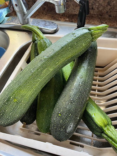 It's a hot muggy July afternoon, with intermittent thunderstorms. Everyone's taking photos of butterflies lately, and I just received my first bag of "extra" zucchini squash. Double chocolate zucchini bread and a cheesey zuke casserole will follow, this evening.