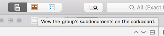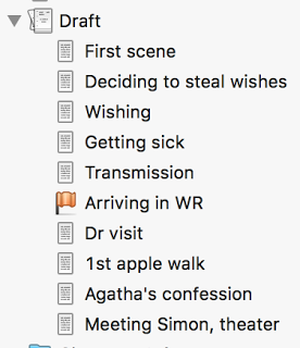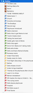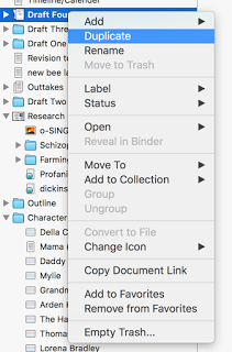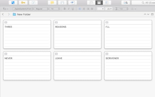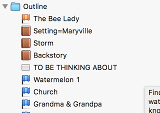 In a perfect world, I'd be using the corkboard feature in the way that it was intended, the way it's shown in how-to videos—to give a brief overview of what was in each chapter so that I could see the outline of my in-process book as I drafted or revised. Honestly, though, I've never found that that helpful. Instead, I typically start a new folder in my sidebar, completely separate from my draft document, and call it "outline."