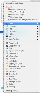 It makes it super easy to navigate between chapters, keep track of what's already happened, and so on. I often will find myself writing a new scene and want to refresh my memory about something in an older scene, and be able to find it really easily because I remember that the older scene took place in the chapter that was about the transmission, or whatever. This feature is helpful for both drafting and revision. In revision, I also use the flags in other ways—to show me where I've identified problems that I don't have time to fix right now, for instance. I'm a really visual person, and also not a super organized person, and being able to see everything laid out like this helps me SO much. Changing the symbols is really easy—you just right-click the icon and it gives you a bunch of options: