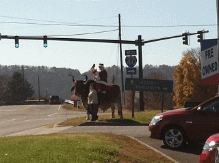 My sister, on her way here to visit, made her husband turn around so she could take this photo. I think I can understand why. When is the last time you saw a giant Brahma bull dressed up like Rudolph, the red-nosed reindeer--with Santa Claus riding on his back?