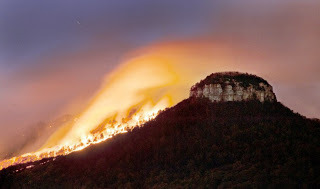 Apparently State Park personnel tried to burn down Pilot Mountain. (Mount Pilot of Andy Griffith Show fame, that would be.) It was one of those "prescribed burn" things. I heard someone comment that people and the media were just "overreacting." I once stayed with a very nice Pilot Mountain woman when I was a member of a classmate's wedding. This was the view from her front door--without the flames, of course. If she still lives there, and not being a total idiot, I imagine she's been "overreacting" quite a bit.