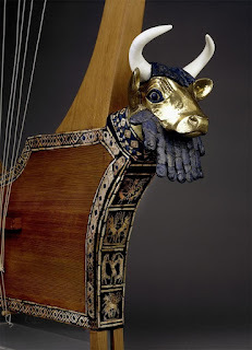 The Bull-headed Lyre of Ur was unearthed in 1926 by British archaeologist Leonard Woolley, during his excavations of the Royal Cemetery at Ur in what is now southern Iraq. It was buried in the tomb of Puabi, a Sumerian queen who lived during the Early Dynastic III period (100-200 years before the setting of my story which takes place during the reign of Šarru-kīn whom we know as Sargon of Akkad, founder of the Akkadian dynasty). Made of gold, silver, lapis lazuli, and shell, the lyre is decorated with intricate carvings and inlays, depicting a variety of scenes from Mesopotamian mythology and everyday life. Since it was buried in the tomb with a queen, it was clearly a highly valued possession.