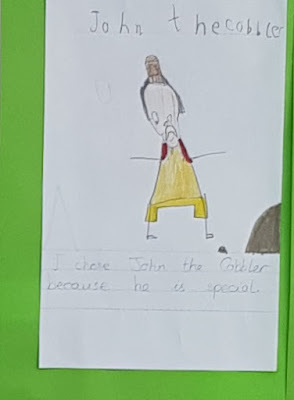 Meet John the Cobbler (an odd choice for favourite, but he's certainly an important character!). I was pleased to discover this had also sparked a class discussion about what a cobbler did.