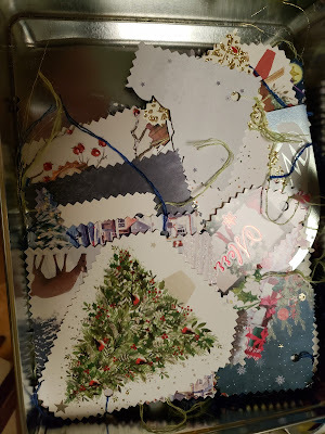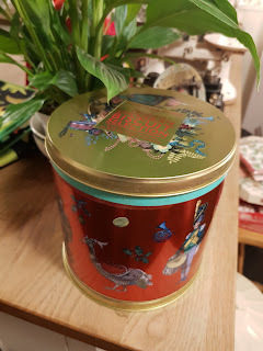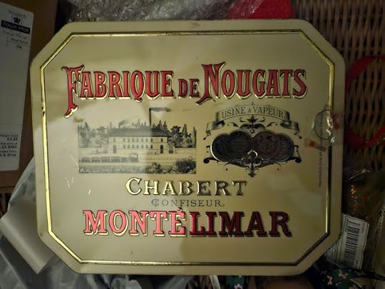 8 - This tin contains the gift tags which we make from previous years' Christmas cards. It's been with us for a long time now and has been used for this purpose as soon as the nougat had been eaten (which didn't take long!).