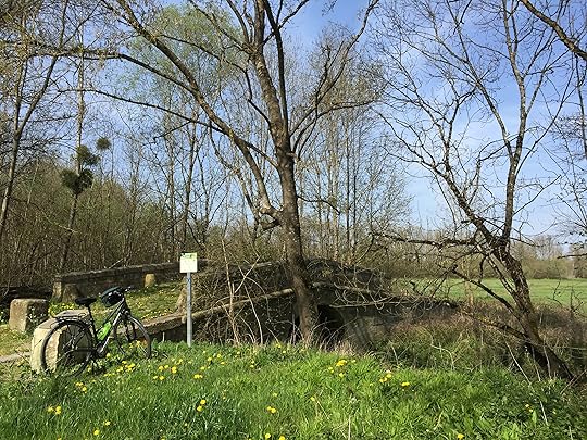 The square bridge allowed the cycleway to pass under a viaduct, which we presumed was a railway. When we discovered it was tarmacked, we decided to follow it – hence the photo of my husband pushing his bike up onto it. Don’t worry, this isn’t a compulsory part of the route.