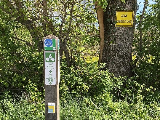 The pretty, shaded path ran directly beside the river and then turned inland to join a grit track. This continued for several kilometres parallel to the Cognac-Merpins road, which was hidden behind a promontory of back gardens. On the right lay the fields and woods of the flood plain, with, unfortunately, no view of the river.