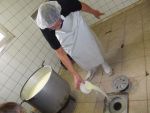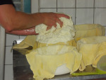 Before we entered the room, which was lightly perfumed with ‘suckling baby’, Dominique had already begun her daily task of heating a vat of the day’s milk to 55°C. While we watched, she made the milk curdle by stirring it with that strange guitar-like instrument. Then she de-curdled it, this time stirring it with her arm for 30 minutes until the curds and whey separated. Next, she gathered the curds, threw away the whey (ooh, those words sound nice together), gathered up the curds into a doughy ball, which she cut into chunks and kneaded into the moulds.
