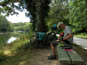 He hasn’t got padded cycling shorts, so I give him my gel saddle-cover. I don’t remember having a sore bum when I crossed France. I’ll be fine. He, on the other hand, believes he’ll be comfortable in his normal underpants and shorts.