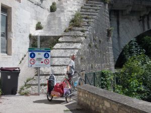 We bump along the towpath, heading towards Angoulême, and stop for water at the Bourg-Charente campsite. I’m amazed at how well our cute trailer copes with the bumps and occasionally erratic steering, though I’m glad we didn’t have it when our kids were young. I’d have suffered minor heart attacks, watching from behind. The kids would have loved being tossed from side to side.