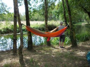 There’s nothing until the village of Montignac-Charente, which is way upstream – at least 12km if we cycle in a direct line on a busy road (which will be hellish with a trailer). We’ve already done the same distance as yesterday – 30km – and are tired. Our fatigue must be due to sleeping too late this morning, because 100km should be well within our reach. Or perhaps we should have had a siesta in the hammocks we brought.