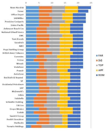 So who are the top 35 companies in these rankings? You can see them in figure 1 below. For the time being ignore the 5 colour coding, as well as funny three-letter acronyms (TLAs) in the figure.