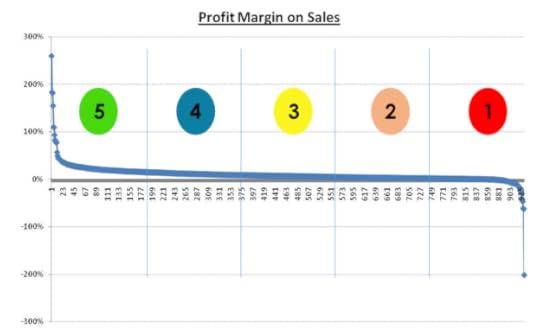 Consider Figure 2 below which shows profits margins on sales for 2012 for 932 companies ranked in a descending order. The names of the companies are not shown on the figure, and all we are interested in is to divide this universe of companies into five sub-universes ranked by profit margins. The highest ranked 20% of the companies get a score of 5 on $eed-to-$tore efficiency because indeed profit margins are derived from efficiencies.