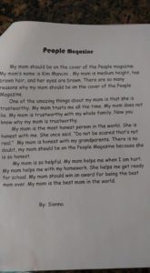 But what did impress me were the character qualities Sienna wrote that she saw in her mom. My daughter is a fitness instructor with a fabulous figure, she’s gorgeous, dresses stylishly, and always looks beautiful. So when Sienna decided to write about why her mom should be on the cover of People Magazine, she easily could have talked about these superficial, outward qualities, but at eight-years old this is what she wrote, exactly how she wrote it, no edits from Grammie: