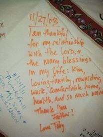 Today, we have years of thankful messages to read every Thanksgiving and remember the many acts of God’s goodness to us and the people who joined us at the celebration table each year. If we go to someone’s house for Thanksgiving dinner, I ask if I can bring our Thankful Tablecloth and markers.