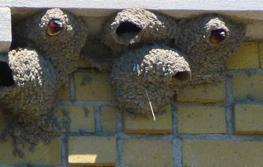 Swallows peeking out of nests, old water processing plant, Toronto beach (click to enlarge)