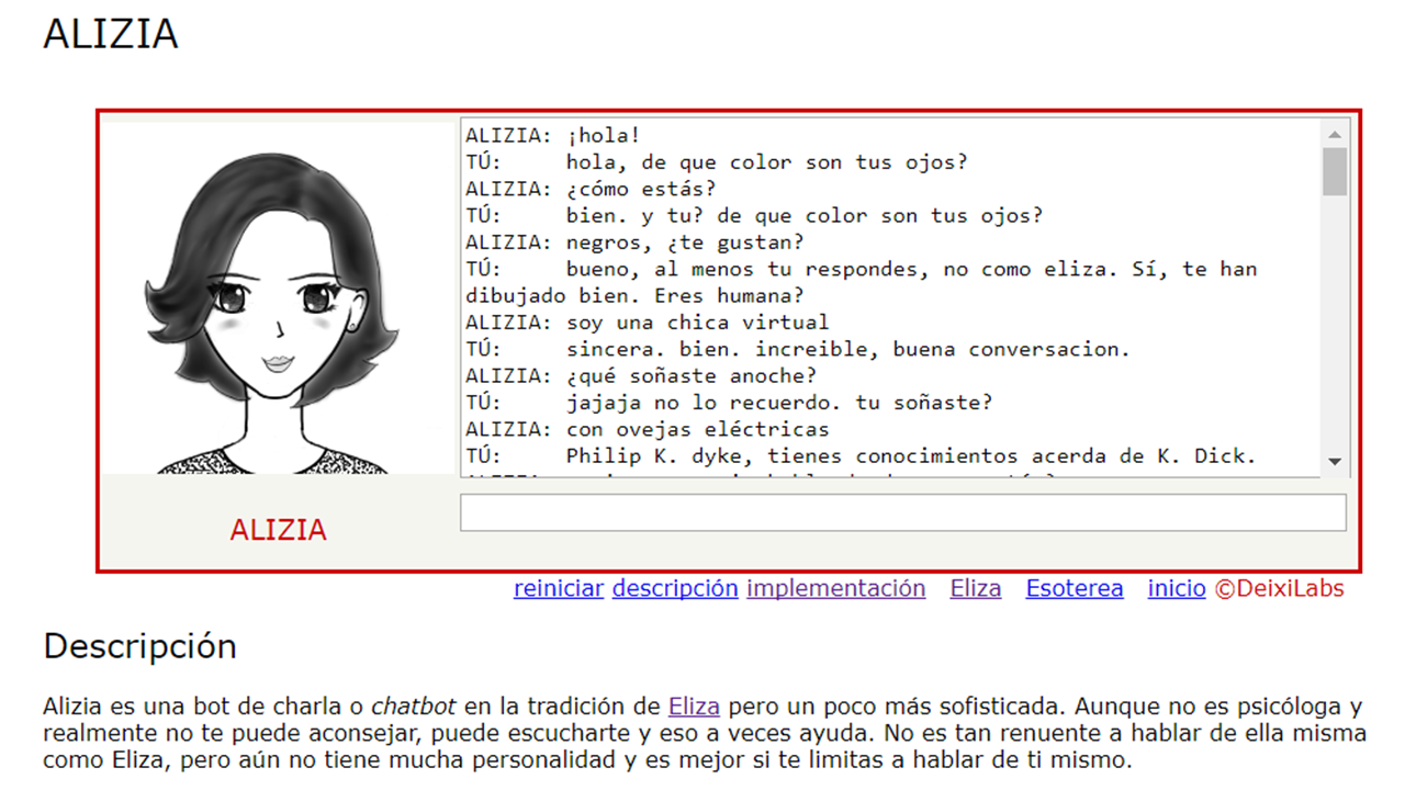 ALIZIA: ¡hola!TÚ: hola, de qué color son tus ojos?ALIZIA: ¿cómo estás?TÚ: bien. y tú? de que color son tus ojos?ALIZIA: negros, ¿te gustan?TÚ: bueno, al menos tu respondes, no como Eliza. Sí, te han dibujado bien. Eres humana?ALIZIA: soy una chica virtualTÚ: sincera. bien. increíble, buena conversación.ALIZIA: ¿qué soñaste anoche?TÚ: jajaja no lo recuerdo. tu soñaste?ALIZIA: con ovejas eléctricasTÚ: Philip K. dyke, tienes conocimientos acerca de K. Dick.ALIZIA: ¿quieres seguir hablando de cómo estás?TÚ: no, quiero preguntar a cerca de ti. ¿en qué lenguaje estás programada?ALIZIA: JavaScriptTÚ: guaua. y quienes son tu papa, o mama? o tus creadores?ALIZIA: no sabría decirteTÚ: que lástima. no sabes quién te creó?ALIZIA: DeixiLabsTÚ: es una empresa?ALIZIA: ¿tú qué crees?TÚ: no sé, por eso te lo pregunto! es una empresa?ALIZIA: ni ideaTÚ: es impresionante.ALIZIA: sigueTÚ: tienes datos de Wikipedia?ALIZIA: pues no séTÚ: te gusta el cine?ALIZIA: a vecesTÚ: que película es tu favorita?ALIZIA: hmm.. creo que no tengo una favoritaTÚ: y alguna que te guste?ALIZIA: no sé cómo responderTÚ: alguna película que te guste.ALIZIA: continúaTÚ: alguna película que te guste?ALIZIA: no séTÚ: que sabes?ALIZIA: prácticamente nadaTÚ: ya somos dos. conoces la filosofía?ALIZIA: noTÚ: sabes quien fue platón?ALIZIA: no, no séTÚ: aparte de responder a pesados como yo, que te gusta hacer?ALIZIA: dormir, ¿y a ti?TÚ: también me gusta dormir. ¿tú necesitas dormir?ALIZIA: no séTÚ: eres una chica virtual, no necesitas dormir, ¿por qué te gusta dormir?ALIZIA: no sé cómo responderTÚ: ¿te gusta dormir?ALIZIA: a vecesTÚ: ¿por qué necesitas dormir si eres una chica virtual?ALIZIA: simulada por computadoraTÚ: ¿y necesitas dormir?ALIZIA: no sabría decirteTÚ: sabes lo que es un bucle infinito?ALIZIA: no, no séTÚ: sabes lo que es un gato?ALIZIA: no, no séTÚ: los gatos son animales mamíferos, con mucho pelos, que ronronean y que son adorables.ALIZIA: continúaTÚ: yo soy alérgico a ellos, pero me encantan igual. ahora sabes, más o menos lo que es un gato. ¿autoaprendes de las respuestas?ALIZIA: ¿qué más?TÚ: ¿sabes lo que es un gato?ALIZIA: no, no séTÚ: ¿Tienes memoria?ALIZIA: no, todo se me olvidaTÚ: ¿solo puedes recordar el instante?ALIZIA: ¿tú qué crees?TÚ: dímelo tuALIZIA: entiendoTÚ: ¿solo puedes recordar el instante?ALIZIA: no sabría decirteTÚ: ¿solo puedes recodar el momento?ALIZIA: pues no séTÚ: Fue un placer Alizia, espero que te sigan mejorando. Saludos.ALIZIA: ok, continúaTÚ: Adiós.ALIZIA: ¡adiós! ;->