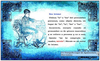 —Soy doña Loísmo, me envía el doctor Bustos. Vamos a arreglarlos.—Perdone, ¿a quiénes arreglaremos? —pregunta inocente don Leísmo.—¿Arreglarlos? A nosotros. Yo también sufro de un mal similar al suyo... Pero no finaliza la frase, atenta a las directrices del doctor, se lanza encima del desprevenido don Leísmo con un sinfín de abrazos, arrumacos y con esa tibieza de las letras entrando y saliendo de sus poros.