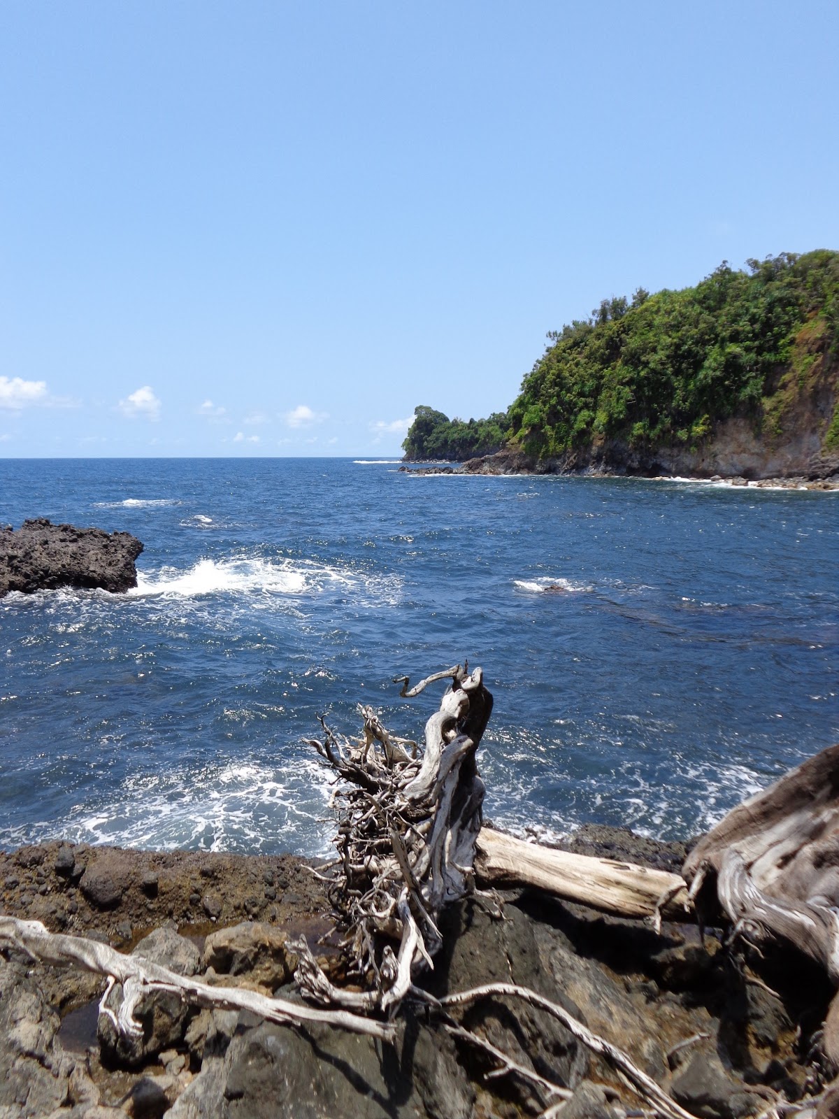 Onomea Bay and Rushing TideI remember how in awe we were at the magnificent color of the sea, of the way the driftwood juxtaposed with the coarse rock, and how the sea gathered into the triangular bay and met the spot where the stream had cut its way downhill, fresh water meeting saltwater.