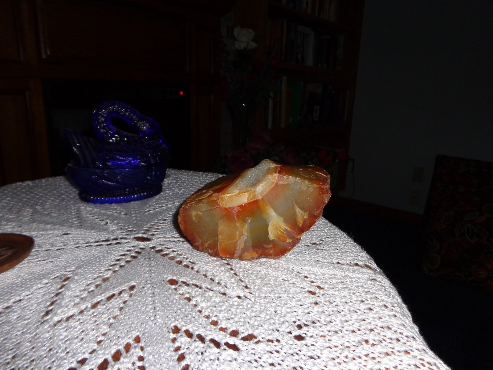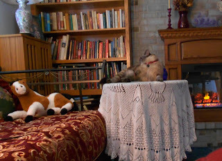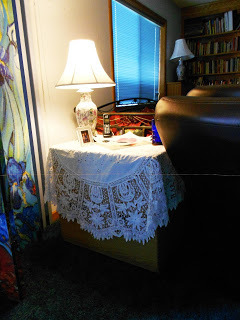 The daybed has sure moved around a lot. We had moved it down to the dining room for Jeff when he got sick, but then realized we would have to use this room. Before we could move it again, he had died. But that's what gave me the idea for changing the room's purpose. On the table closest to the fireplace, you see a white knitted table cloth. I knitted this maybe 20 years ago, using an old lace doily pattern on a larger scale. It's an odd yarn-maybe dacron-that is strong, washes well, and was extremely cheap, so I ended up with two different round tablecloths. The other one is Battenburg lace, which I found cheap years ago because it needed repairs. My cats used it for hide-and-seek, unfortunately, so once I finished most of the repairs, I put it over this file cabinet, and now they can't hide under it. It's old, fragile, and was probably never of great value, but I love it, and will keep on working until all the hundreds of thread breaks are fixed.