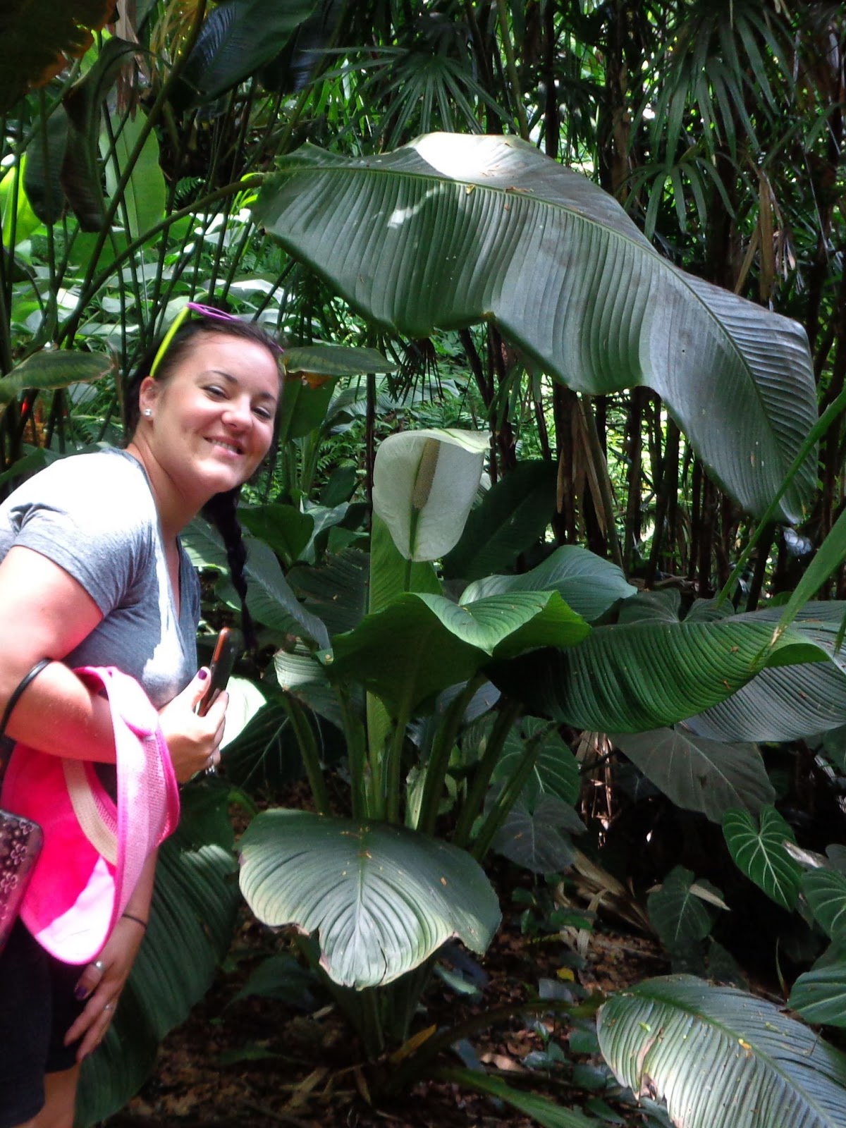Orange HeliconiaSomewhat like this flashy smile Kelsy is wearing. There are Peace Lilies everywhere. They're a common houseplant here on the Mainland-I have two. But I've never seen a blossom stalk as huge as this one, so Kelsy graciously bent down to let me compare the bloom's size with her face.