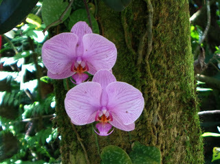 Phalaenopsis OrchidThere's an entire garden devoted to orchids, although nothing here grows alone. Orchids are often found growing on trees, as this Phalaenopsis does. My dad grew orchids too, and I've always loved them. I remember how Jeff was so amazed at all the orchids in the garden, growing in their natural settings.