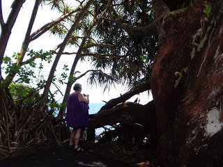 Jeff's Daughter Pam at Onomea BayI remember wishing I could see it in full flow after a heavy downpour. There would be a small waterfall, and the wild surf would throw it back upon itself. There's still an overhang where the tide is slamming the rock beneath the falls' steep descent.Pam, Betty and Kelsy were wonderful traveling companions. And they understood how much this trip meant to me on so many levels.