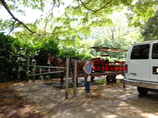 Tracy with The BoysMules are very interesting animals. They combine the best of both donkeys and horses. They're very strong and smart, and they pull well. But yes, the wagon jerks into motion. And on the bumpy road, they plodded faithfully along, with the dogs running alongside. One of the dogs always goes the entire trip, and sometimes the other two do too.