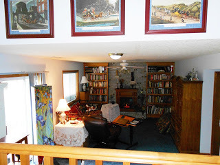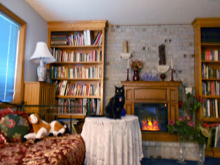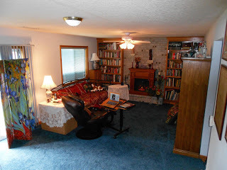 But this is my special project, partially inspired by my daughter Lori, who built her own She Cave. There isn't actually a lot of new stuff. I had the bookcases built a number of years ago, and they hold maybe a third of my books. This is a cold room-it is the lowest point in a tri-level, and while it's wonderfully cave-like and cool in summer, it's hardly bearable in winter, so we're re-vamping a lot of things to change that. The fireplace is an electric heater. (I had to give up on wood smoke years ago). A lot of decorative pieces have been relieved from over-burdened places in the rest of the house, and these are mostly nostalgia pieces. The mini horse is a gift from friend SamMarie Ashe in honor of the novella we co-wrote, THE BOSS WORE RED.