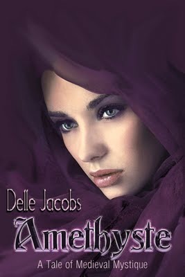 I did this cover design for one reason. To demonstrate how compelling just a face can be. I've hinted that the story is medieval. But I could have put in a verbal hint that it was contemporary, and truly her heavily made up face suggests that. But that's a side issue because there is no story. The very simplicity, the stark sharpness of her makeup and the flowing folds of the dark purple scarf (chiffon, I can tell in close-up) meld into the background. If anything is fanciful, it's the lettering. But since the photo compelled me to call her Amethyste, a name I made up just for her, I felt it demanded to come out looking like a carved jewel. There's room for that because it has so little competition.