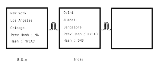 Wait, there is something more. Each of these blocks has something called a hash. A hash is a set of characters (eg. “1hi515AHA5H” ). Hash is derived from the information contained in the block. The block of U.S.A has cities New York, Los Angeles, and Chicago. So the hash would be something like “NYLAC” (Technically that’s not the case, but you get the idea).
