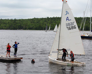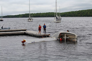 On the waterfront in Shelburne, this group was conducting a first lesson for new sailors. How to right, and get back in a capsized boat. The blonde woman in the boat was the student, the tall brunette standing in the boat, and the guy in the water were the instructors. The student managed to get the boat upright, and scramble back inside, all while keeping up a running monologue of hilarious comments.