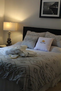 Sparky and I have a choice of two lovely bedrooms, our own kitchen, an enormous bathroom/shower, laundry facilities, and multiple choices of how to make my coffee. Espresso. Kuereg. Or standard filter. Amazing. The hosts Angela and Aaron are warm, welcoming people. The property has a beach where guests can have a bonfire (unless the no-campfire regulation is in effect).