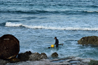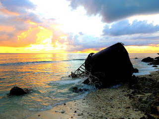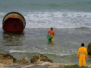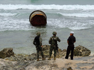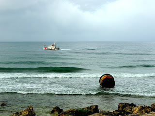 2014 Oct 7th, buoy down and rolling across coralFifteen minutes later it ran aground, tipped over, and ponderously rolled in the waves until it was stuck about twenty feet from shore. We emailed a friend who knew how to contact the naval base to advise them of the problem. A group of marinas (sailors) arrived, a non-commissioned officer and his crew, to check out the buoy.